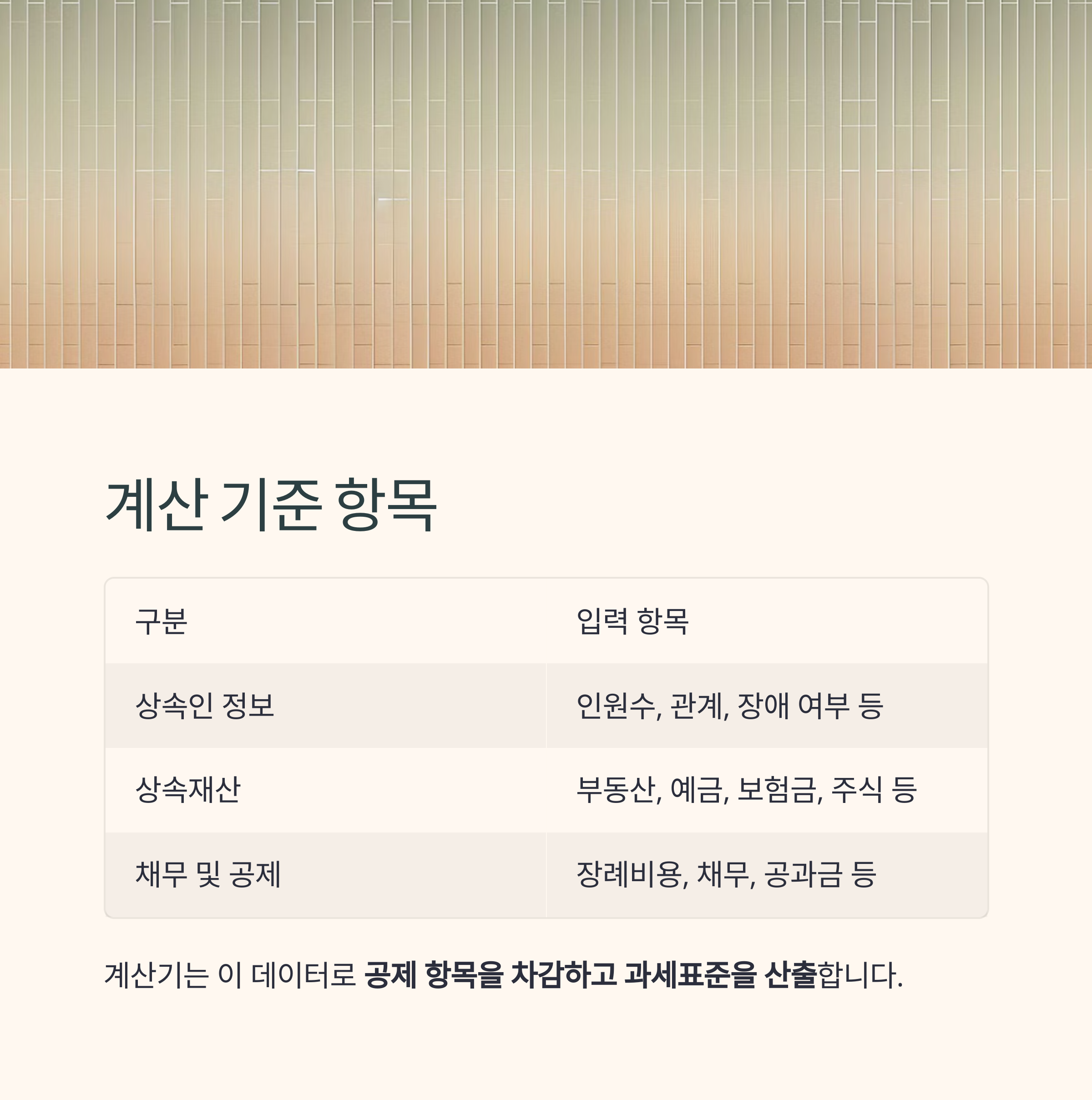 상속세 계산기는 다음과 같은 항목을 기준으로 계산을 수행합니다.