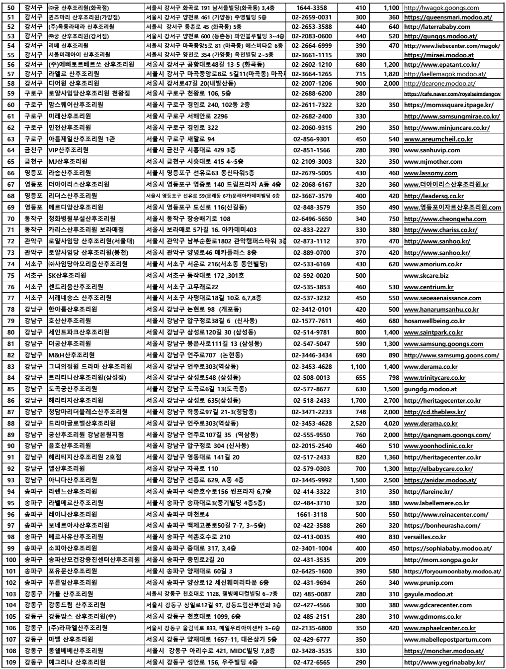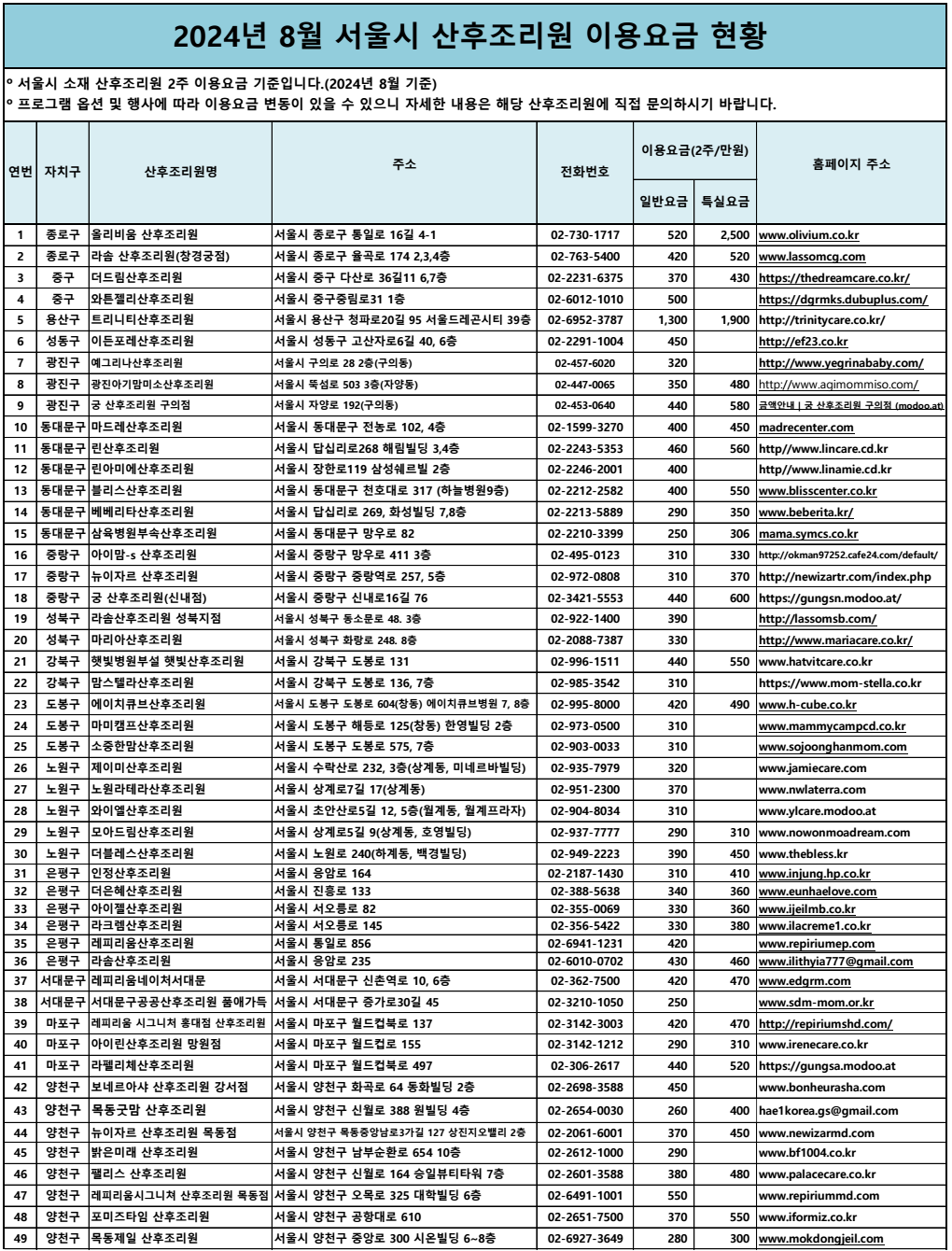 서울시가 공개한 112곳 산후조리원 금액 비교표