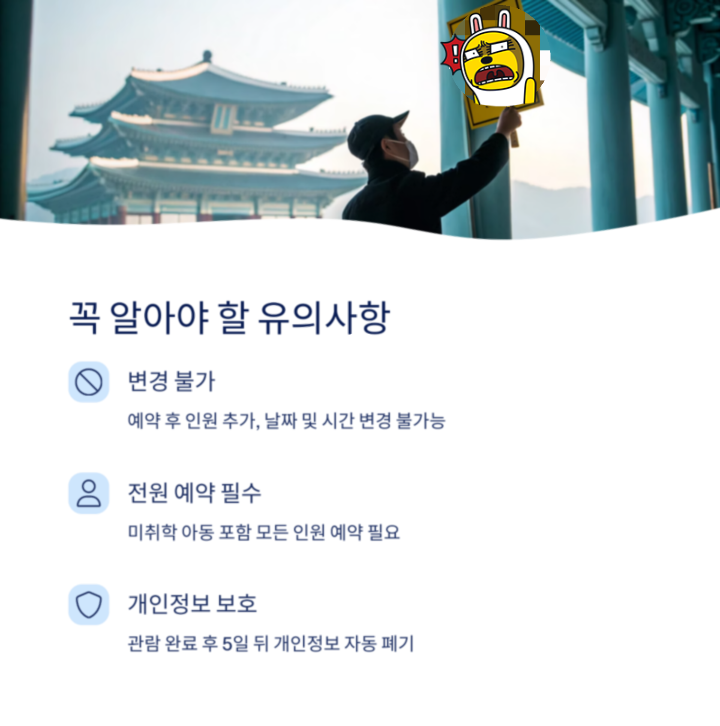 - 예약 날짜 및 시간 변경 불가 (공연, 전시 포함)