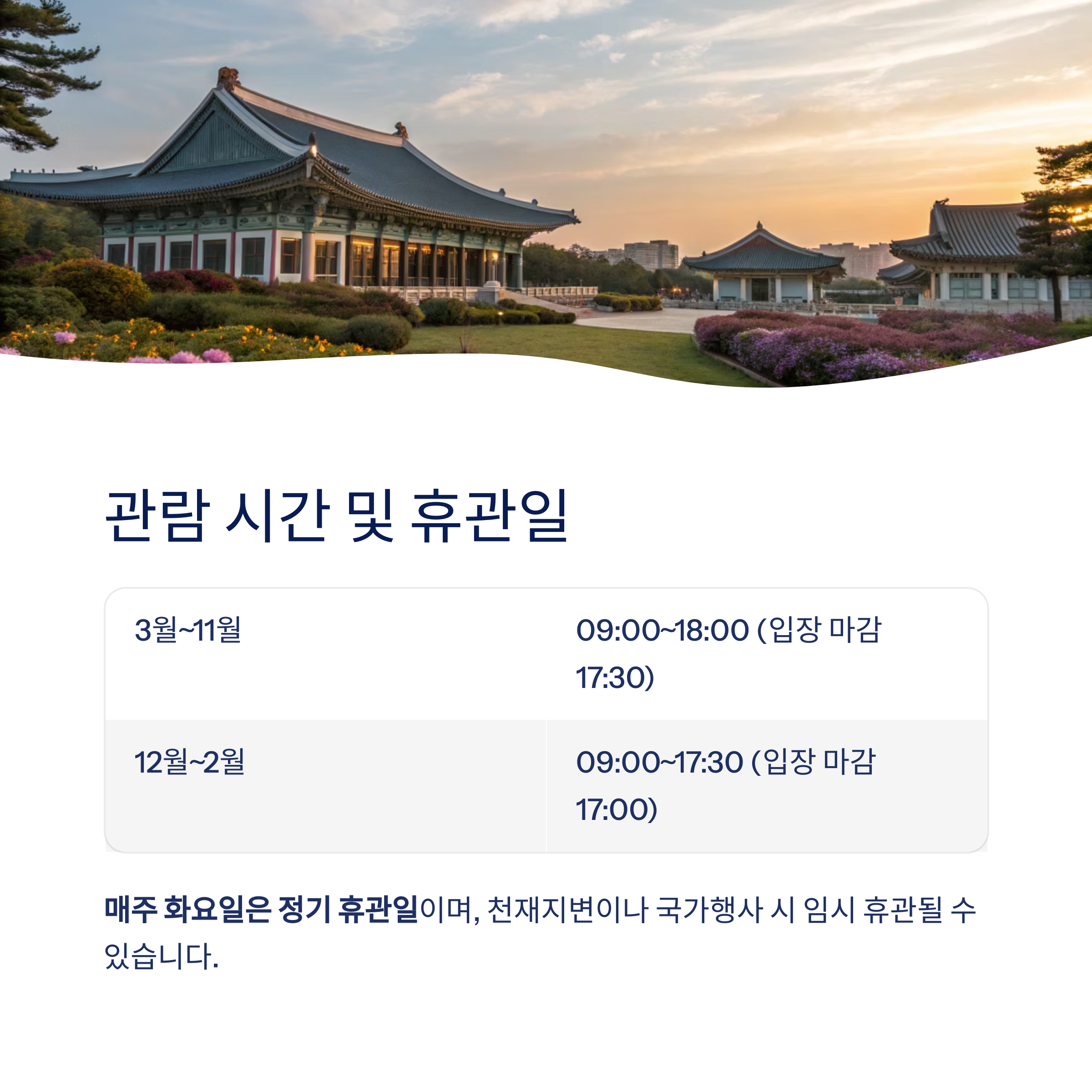 천재지변, 국가행사 시 임시 휴관될 수 있으므로 방문 전 확인이 필요합니다.