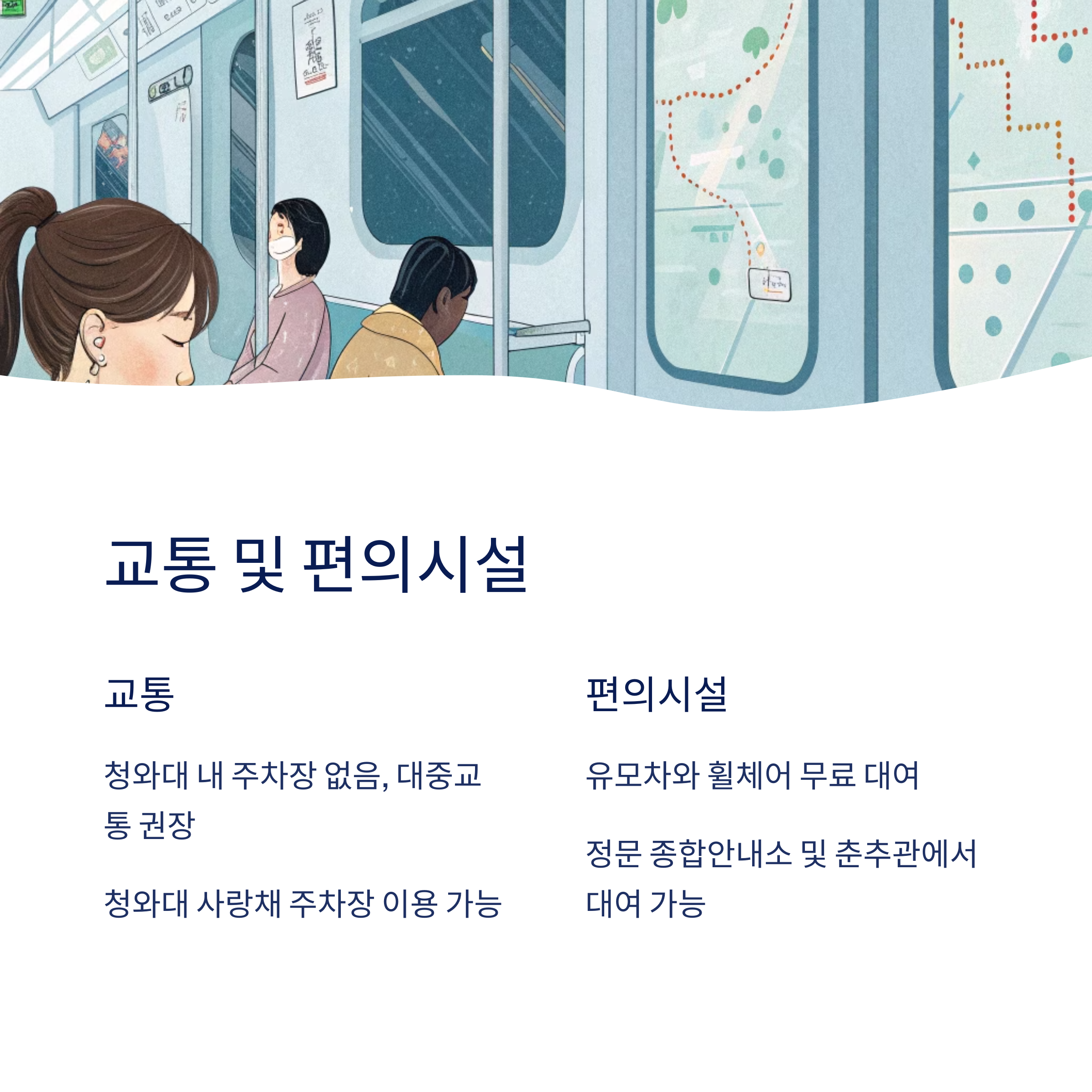 청와대 내에는 주차장이 없기 때문에 대중교통 이용을 권장합니다.