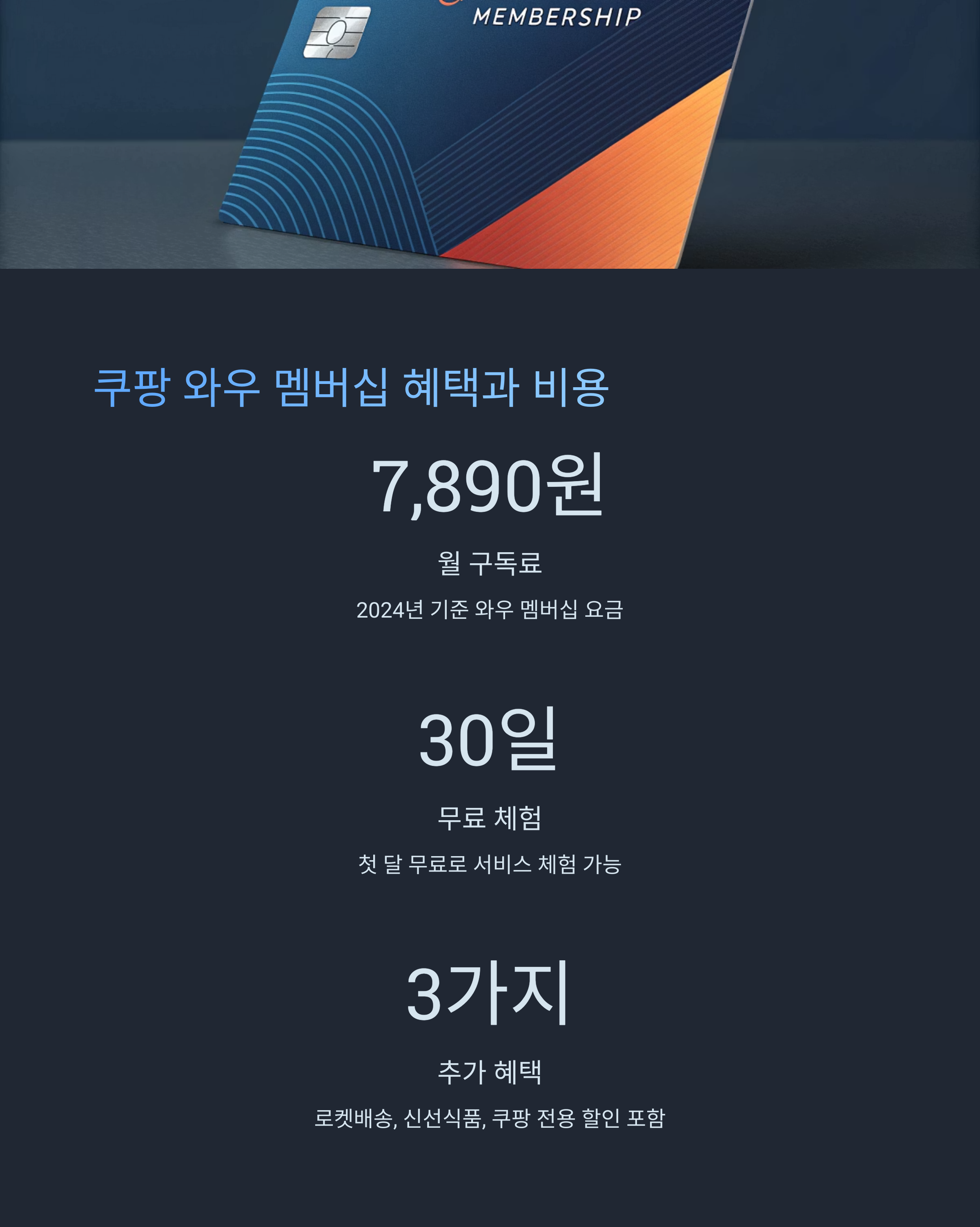 2024년 인상된 쿠팡 와우 멤버십 요금은 월 7,890원입니다. 비싸다고 느껴질 수 있지만, 로켓배송·신선식품·쿠팡 전용 할인까지 포함한 가격이라는 점에서 여전히 매력적입니다. 특히 가입 첫 달은 30일 무료 체험이 가능하기 때문에, 실제로 체감해본 뒤 결제 여부를 결정할 수 있어요. ‘쿠팡플레이 무료’ 서비스를 더 풍성하게 즐기고 싶다면 와우회원 등록도 고려해보세요.
