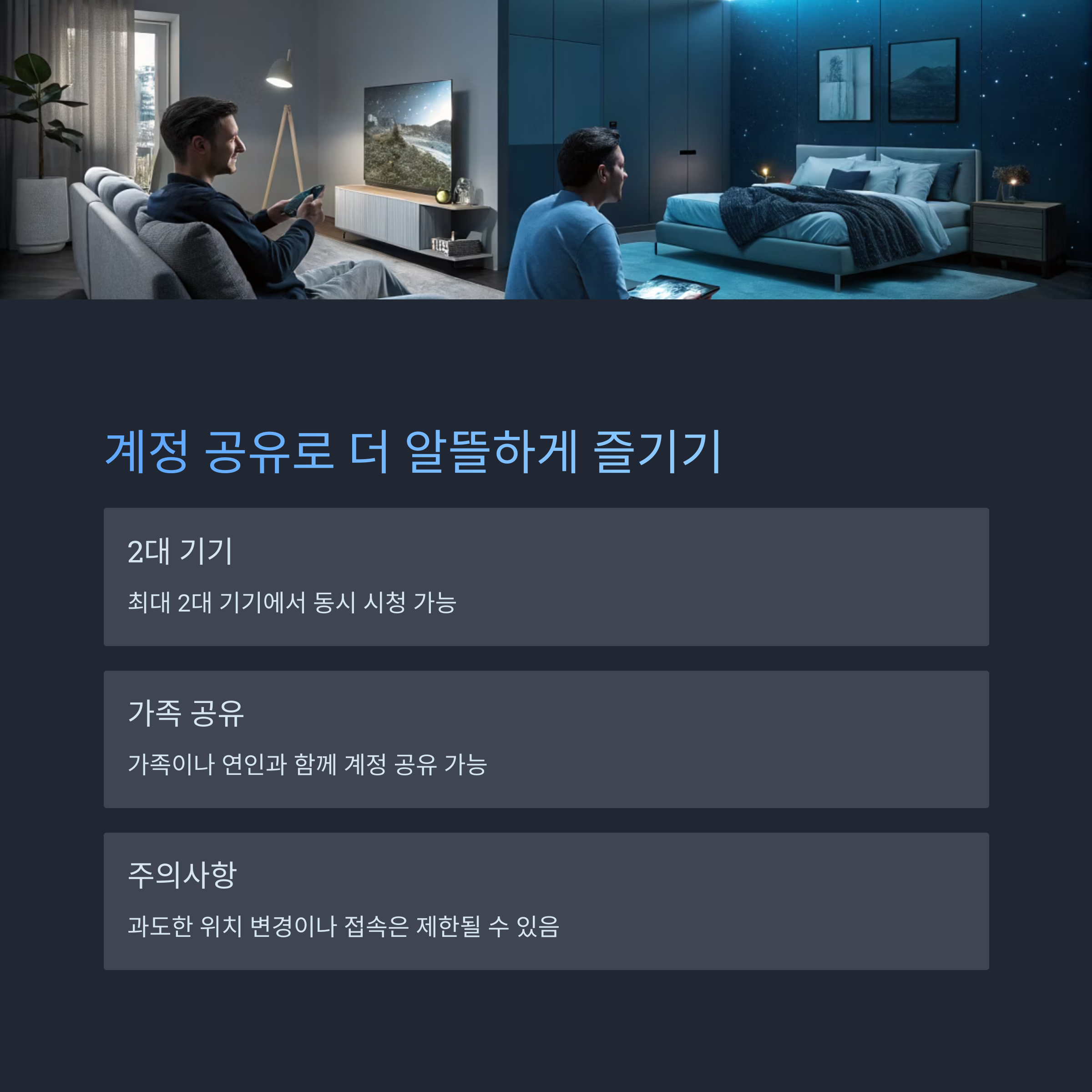 쿠팡플레이는 한 계정으로 최대 2대의 기기에서 동시 시청이 가능합니다. 가족 또는 가까운 지인과 함께 계정을 공유하면, 추가 비용 없이 다양한 콘텐츠를 함께 즐길 수 있어요. 단, 계정 공유 시에는 과도한 접속이나 위치 변경은 피해야 하며, 서비스 정책에 맞게 이용해야 합니다. 이런 활용까지 고려하면 ‘쿠팡플레이 무료’는 정말 알차게 활용할 수 있는 OTT 서비스입니다.