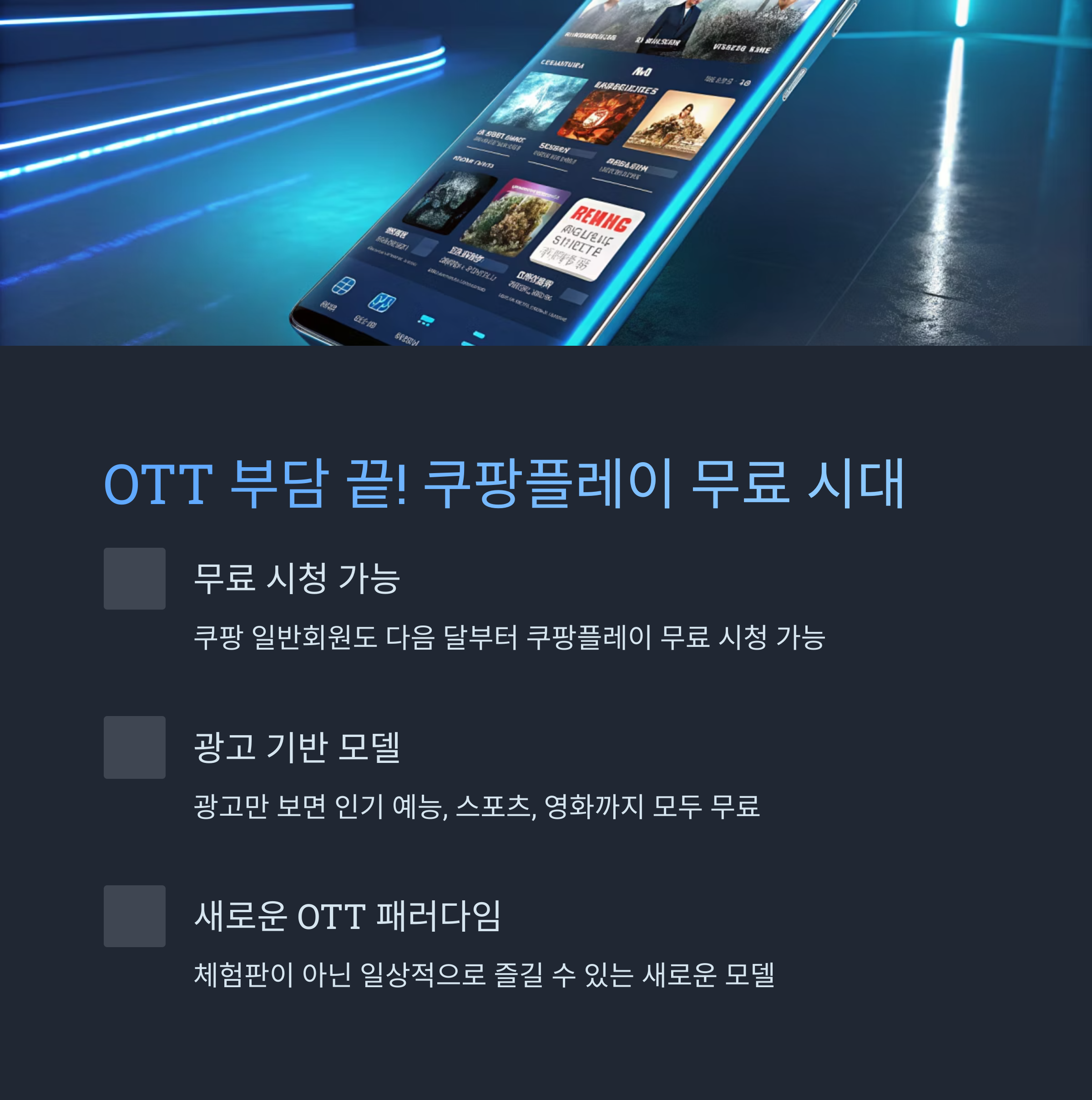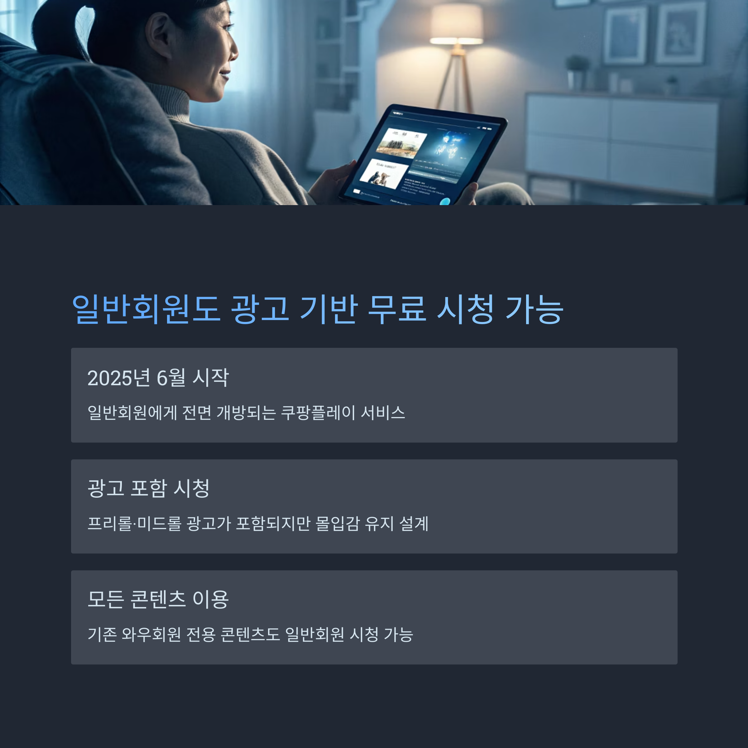 쿠팡플레이가 드디어 큰 결단을 내렸습니다. 2025년 6월부터 쿠팡 일반회원도 광고만 시청하면 모든 콘텐츠를 무료로 즐길 수 있게 되었어요. ‘쿠팡플레이 무료’는 단순한 이벤트가 아닙니다. 업계 최초로 일반회원까지도 전면 개방된 OTT 서비스, 그야말로 혁신적인 변화예요. 와우회원만 누리던 쿠팡플레이의 재미를 이제 누구나 누릴 수 있는 시대가 열린 셈입니다.