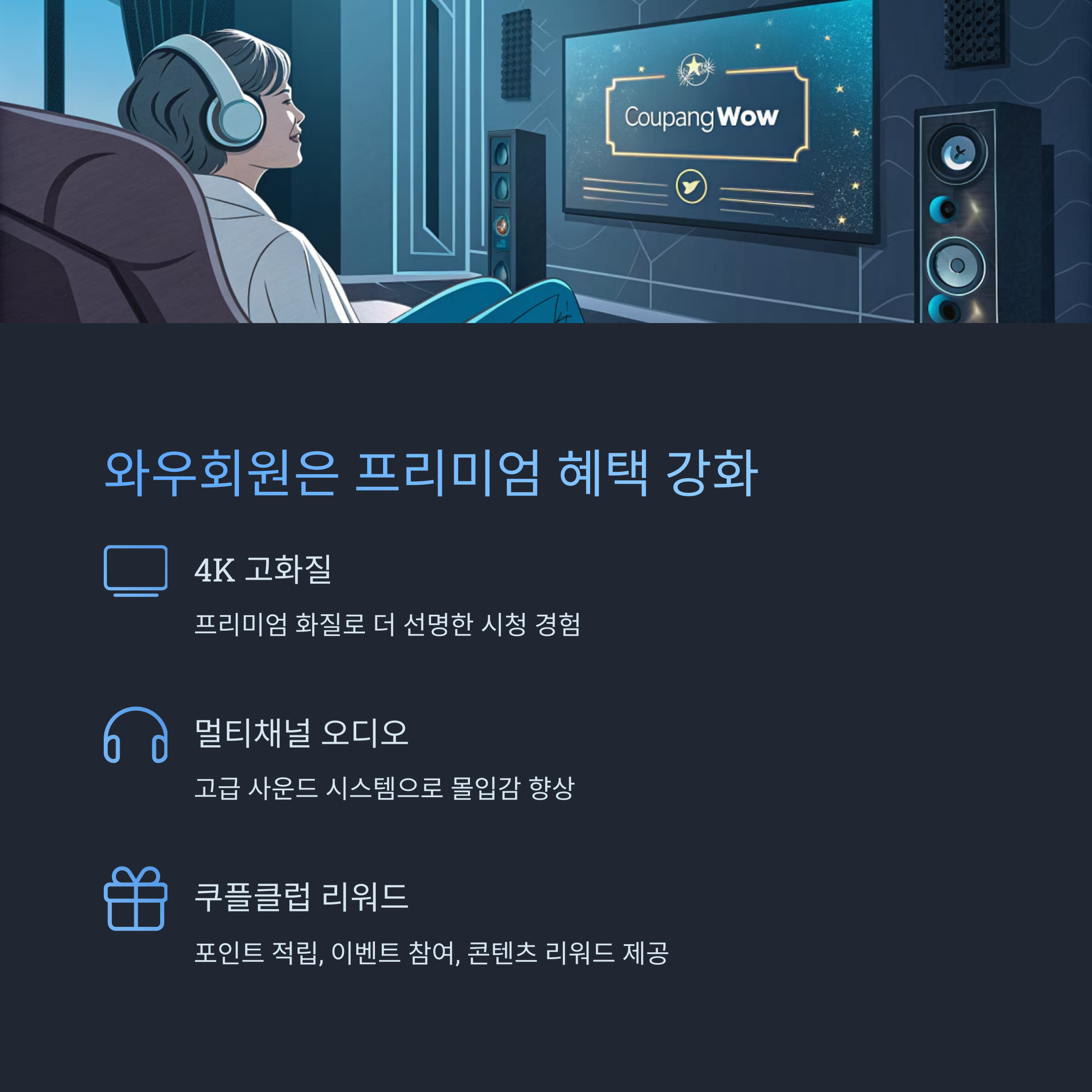 일반회원도 무료로 이용할 수 있다면, 와우회원은 손해 아닌가요? 걱정 마세요. 기존 쿠팡 와우회원에게는 4K 고화질 스트리밍, 멀티채널 오디오, 현장 방청, 최신 영화 무료 제공 등 프리미엄 혜택이 더욱 강화됩니다. 특히 ‘쿠플클럽’이라는 리워드 프로그램을 통해 포인트 적립, 이벤트 참여, 콘텐츠 리워드 등을 받을 수 있어 여전히 차별화된 혜택을 누릴 수 있습니다. ‘쿠팡플레이 무료’의 진정한 고급 버전은 바로 와우회원이죠!