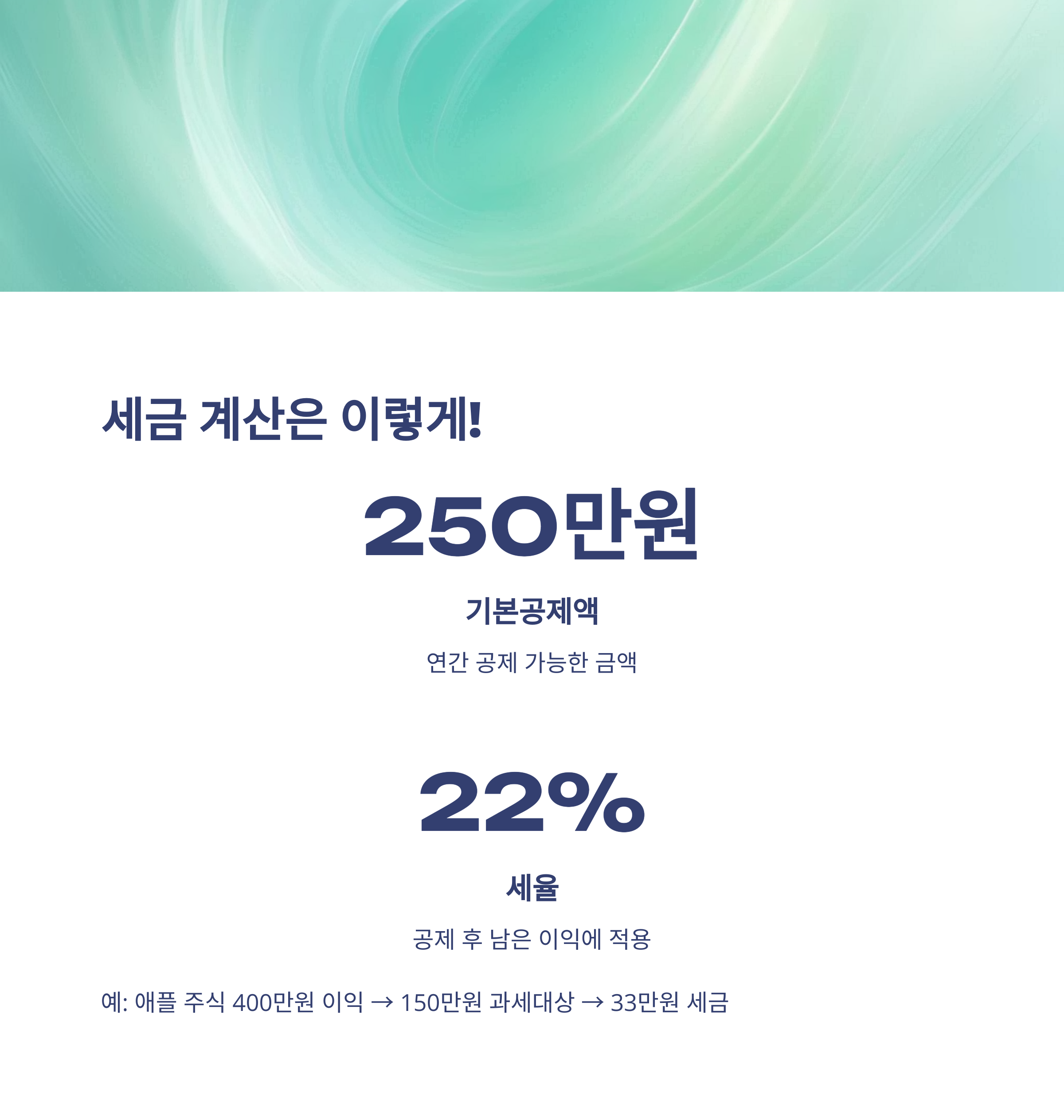 - 애플 주식으로 400만 원 이익 → 400 - 250 = 150만 원 과세
