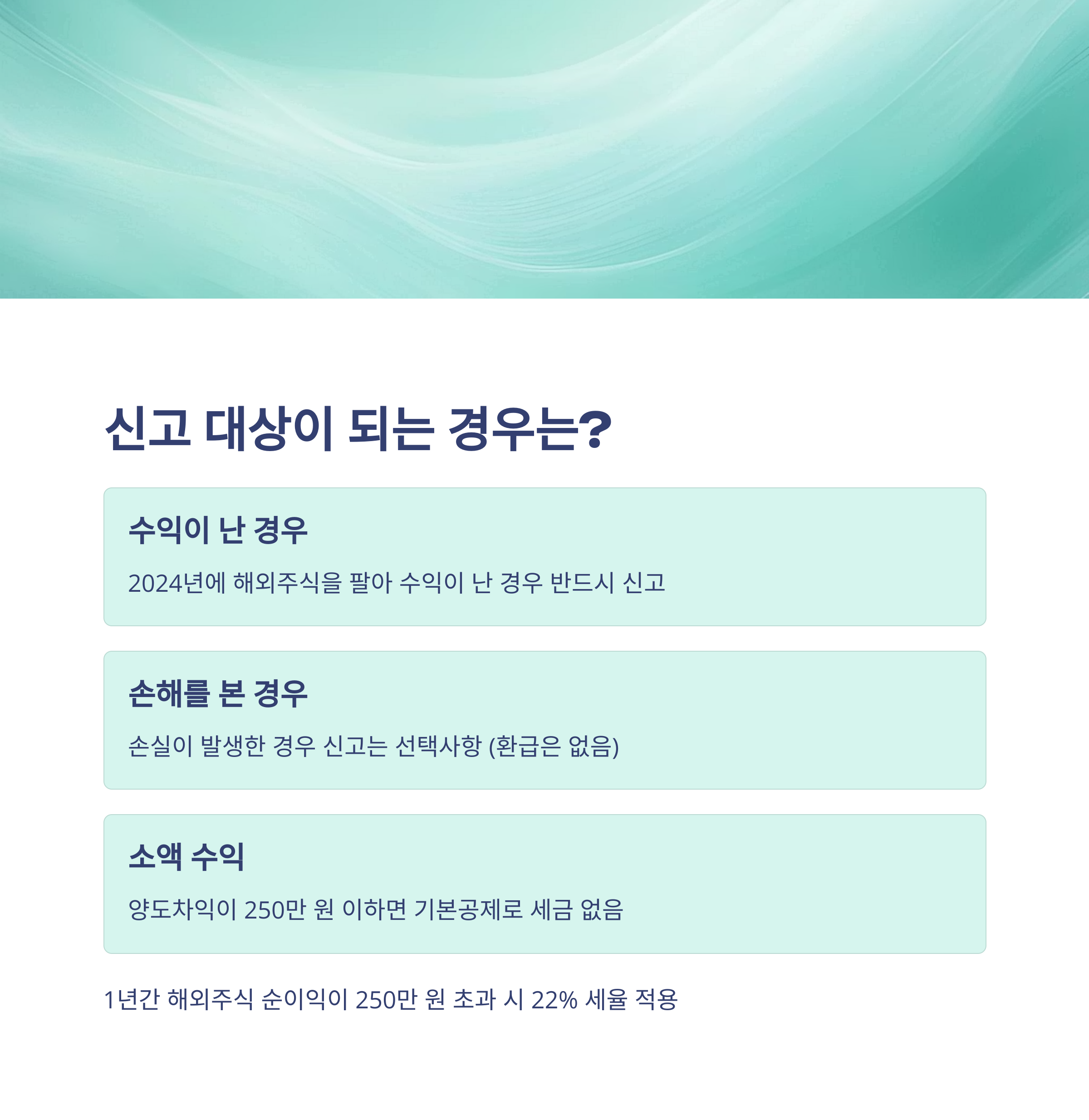 | 2024년에 해외주식을 팔아 수익이 난 경우 | ✅ 반드시 신고 |