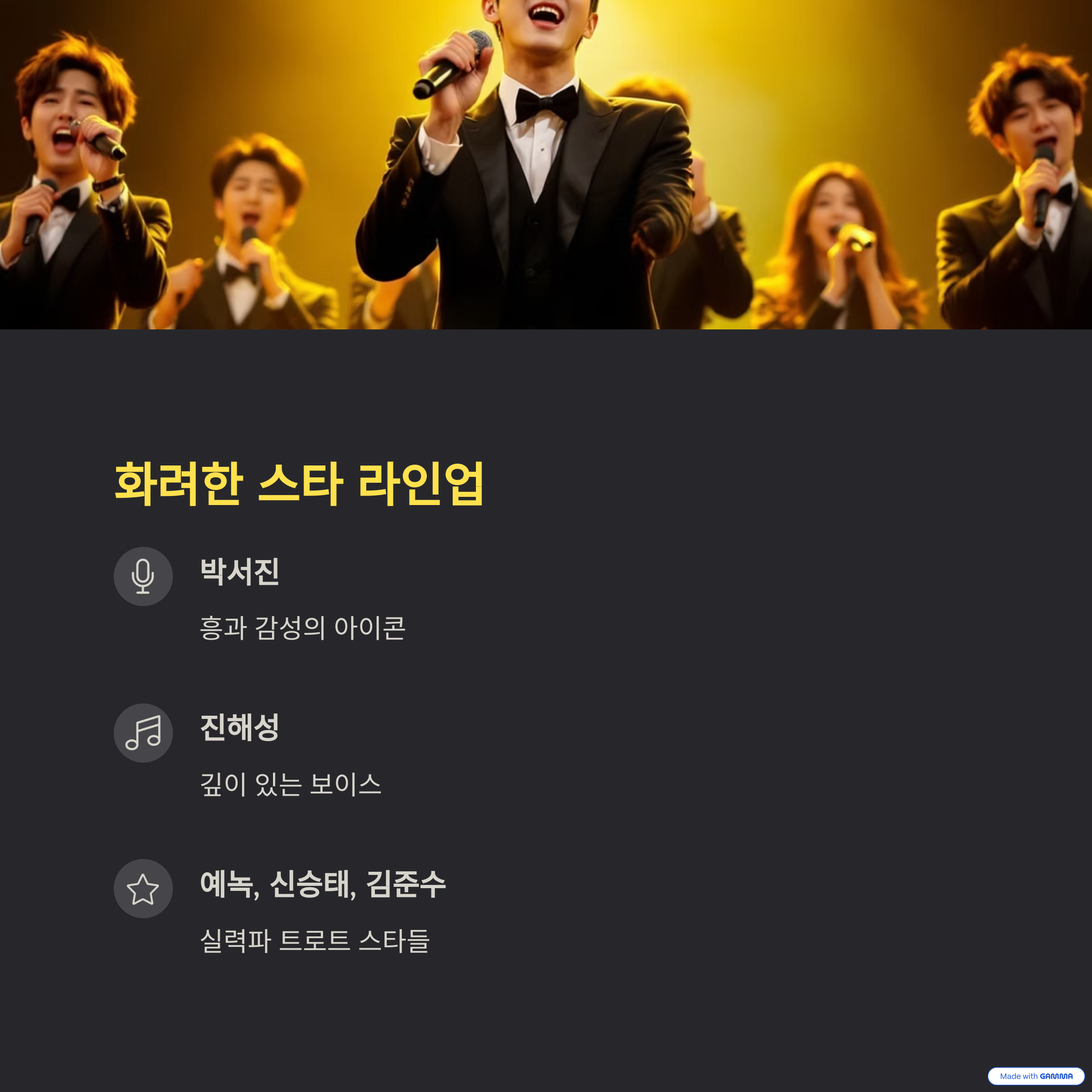 박서진, 진해성, 예녹, 환희 등 트로트 대표 스타들이 총출동하며, 화려한 라이브 무대와 감동의 퍼포먼스를 선사할 이번 공연은 매진 행진 중이니 아래 버튼을 눌러 예매를 서두르세요!