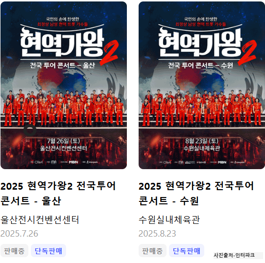 국민의 선택! 현역가왕2 전국투어 콘서트가 2025년, 전국 11개 도시에서 팬들을 만납니다. 서울부터 부산, 대전, 광주, 인천, 수원까지 — 트로트의 열기를 무대 위에서 직접 느낄 수 있는 최고의 찬스!