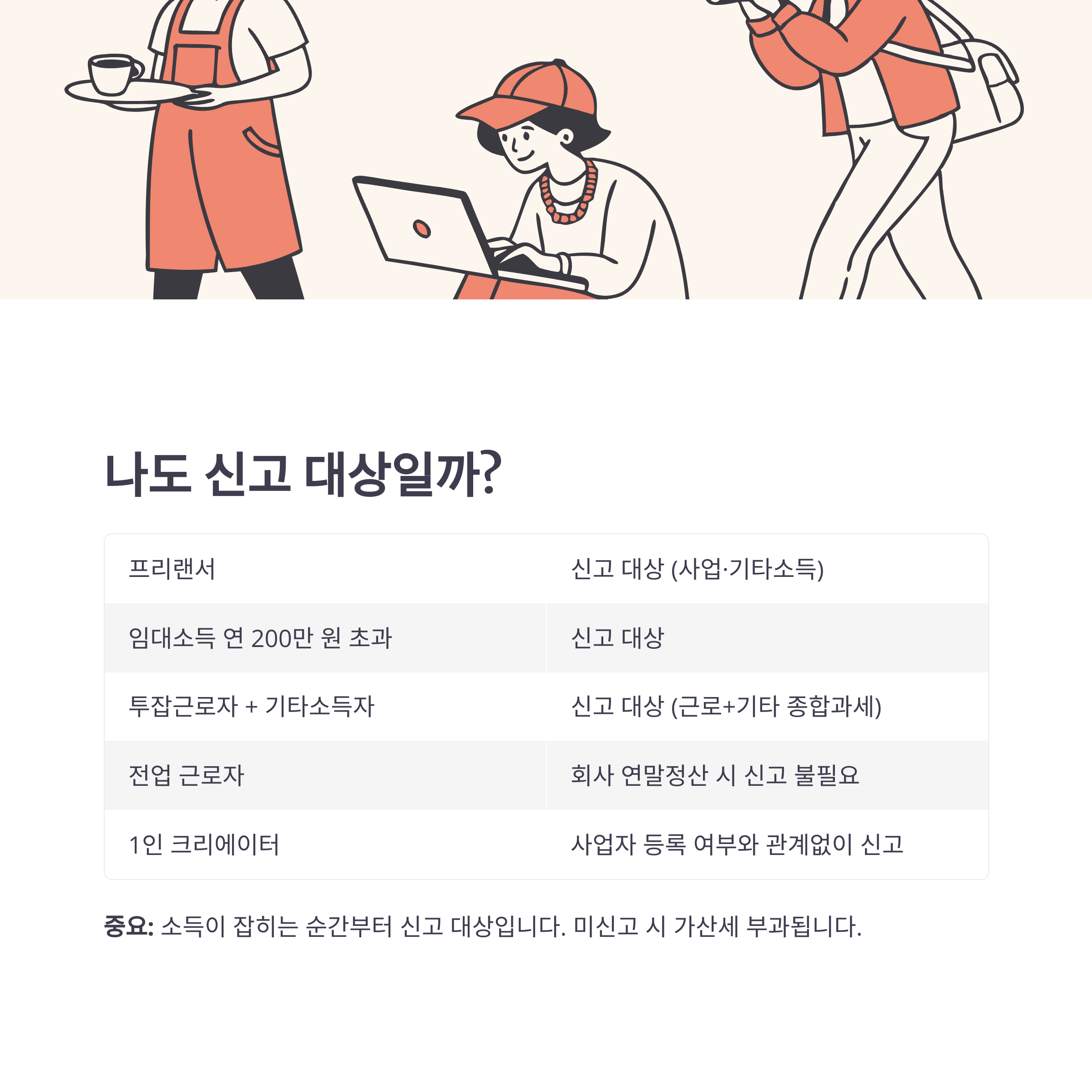 중요: 소득이 잡히는 순간부터 신고 대상입니다. 미신고 시 가산세 부과됩니다.