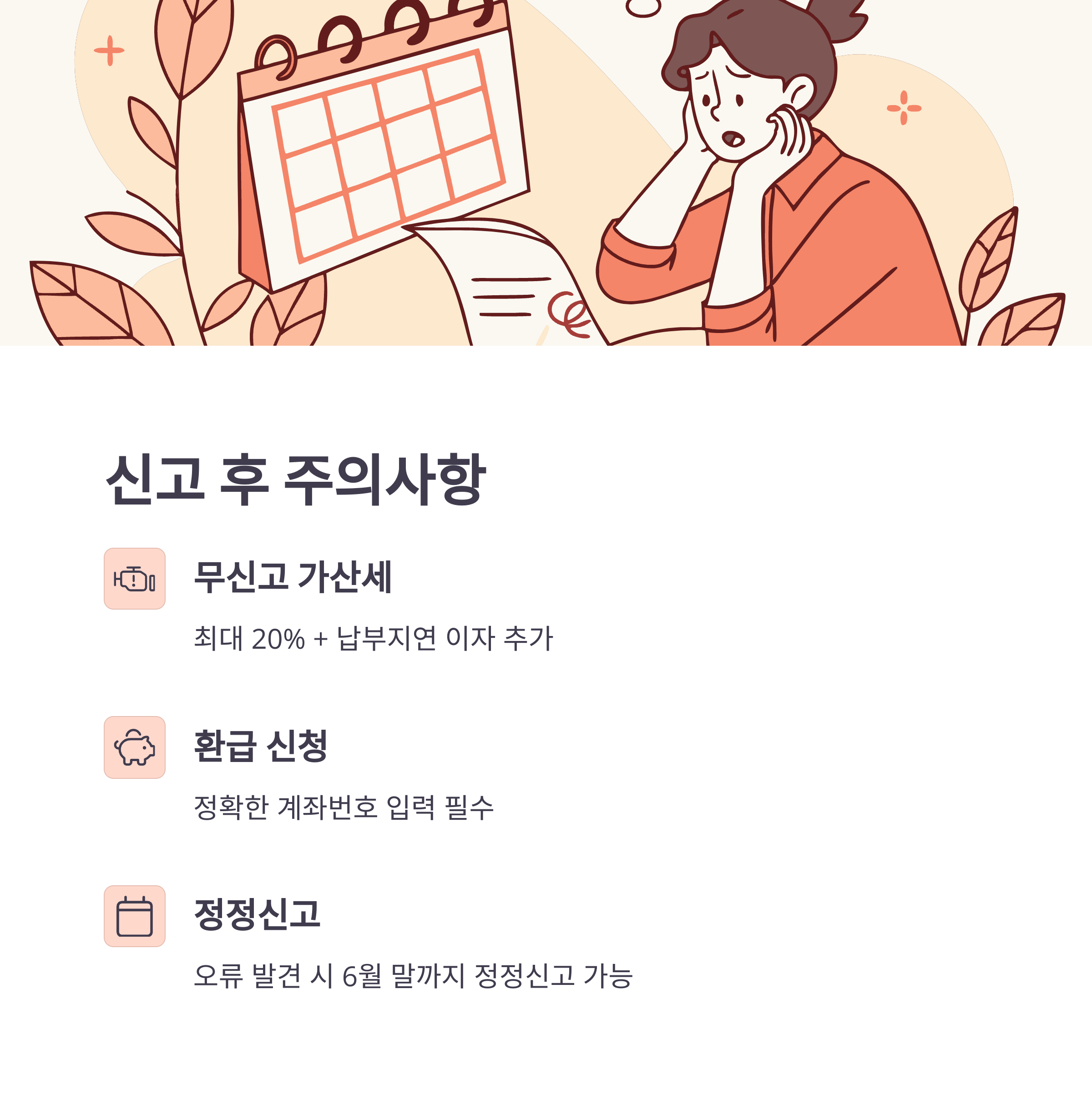 - 무신고 시 가산세 최대 20% + 납부지연 이자 추가