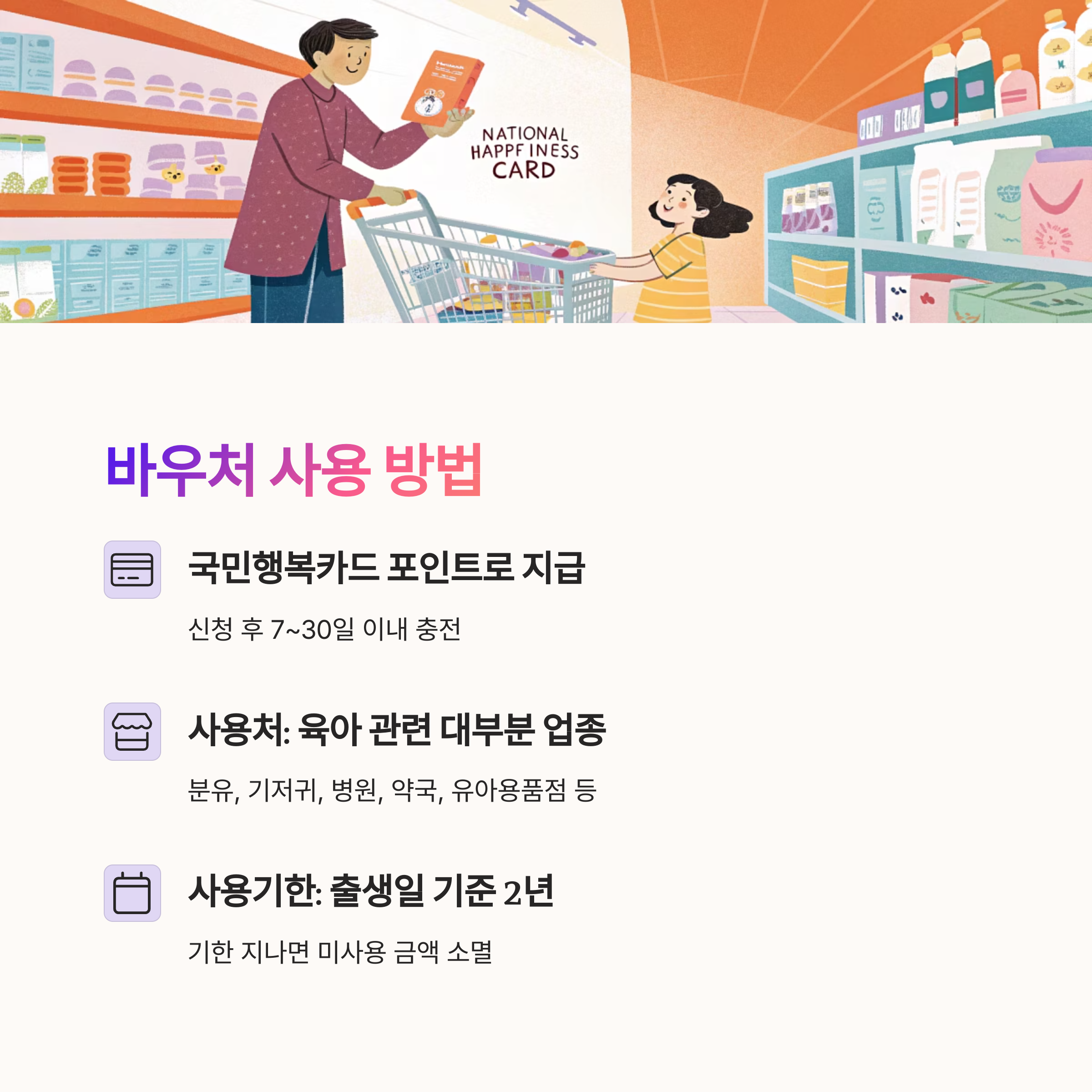 사용처 분유, 기저귀, 유아병원, 약국, 유아용품점, 온라인 쇼핑몰 등