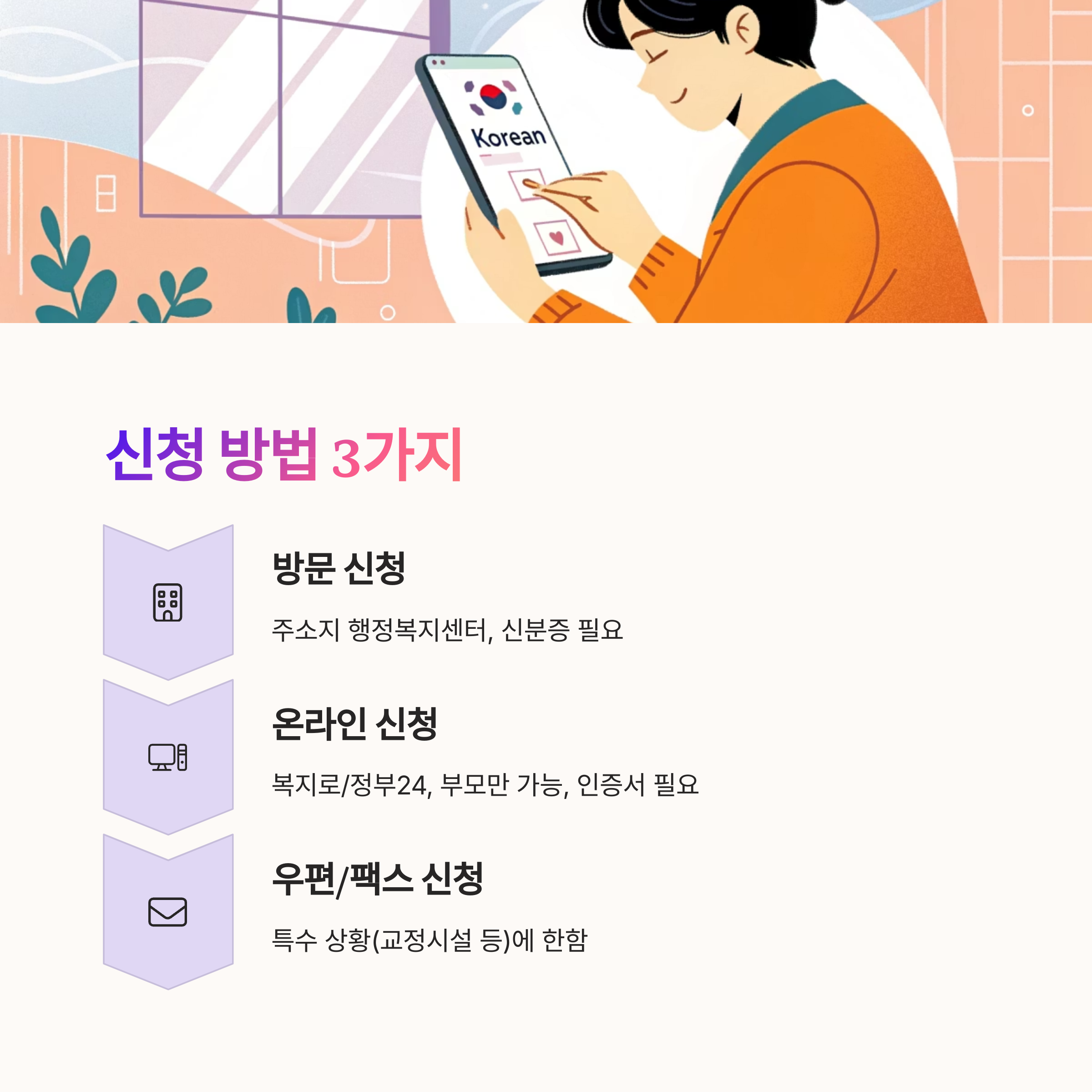 신청 경로 주민센터 방문 / 복지로·정부24 온라인 / 우편·팩스